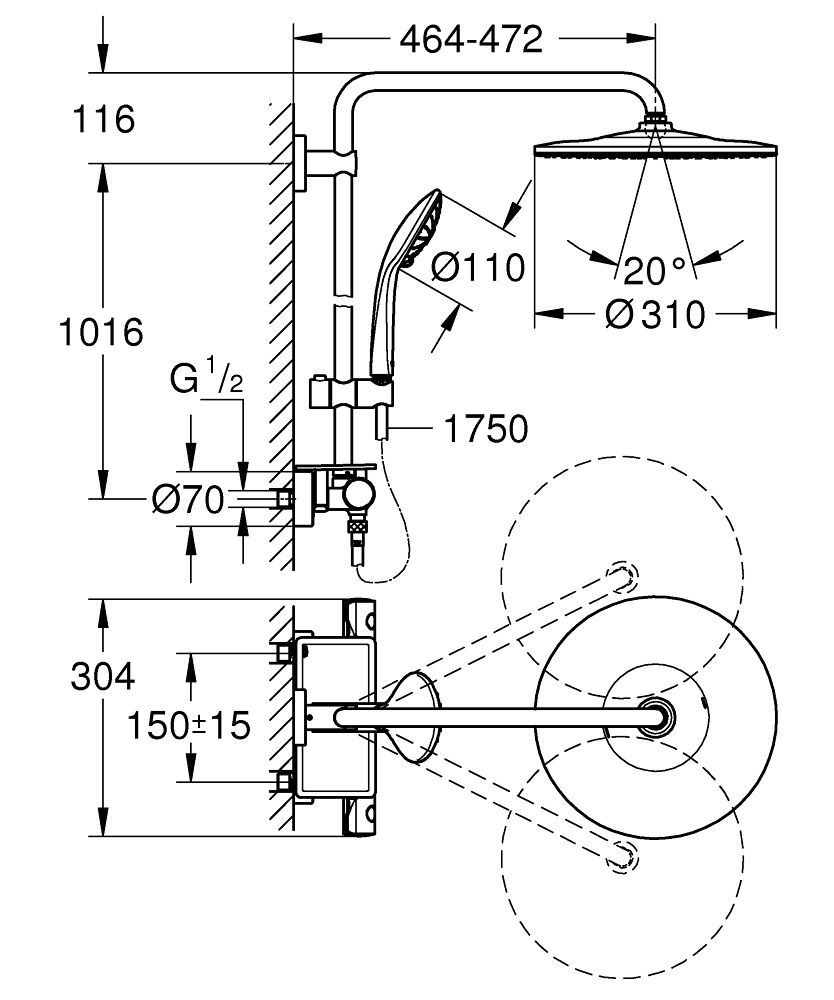 Composé de : Bras de douche de 450 mm orientable horizontalement, mitigeur thermostatique incluant fonction inverseur 2 sorties, douche de tête Rainshower Mono 310, jet : Rain, GROHE PureRain, avec rotule, angle de rotation ± 15°, douchette à main Euphoria 110 Massage, 3 jets : Rain, SmartRain, Massage