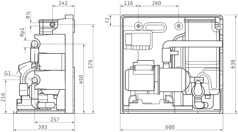 Installation automatique de récupération d’eau de pluie et de réalimentation en eau potable (Aqua Feed). Pompe centrifuge auto-amorçante, horizontale et multi cellulaire de la gamme Multicargo MC-Débit (m3/h) avec rendement optimal.