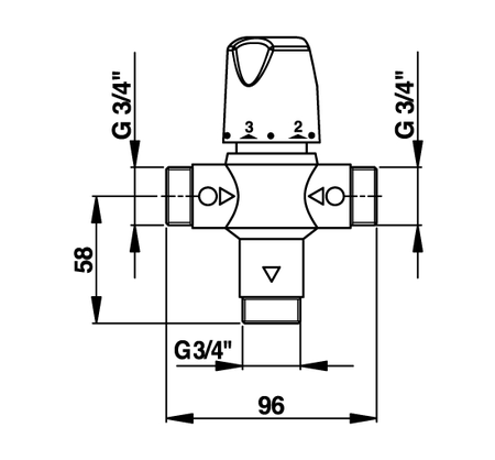 Régulateur thermostatique de sécurité, permet de produire de l’eau mitigée de 30°C à 65°C pour 1 à 3 postes sanitaires, Débit : 55 l/mn à 3 bars, ACS, clapets anti-retour NF, arrivée eau chaude et eau froide M G ¾’’ (20x27), sortie eau mitigée : M G ¾’’ (20x27). Cette pièce résiste à une température de 75°C dans le cadre de chocs thermiques pour éradiquer la legionelle, coupure d’alimentation en eau chaude en cas de coupure d’eau froide Possibilité de blocage de la température interne