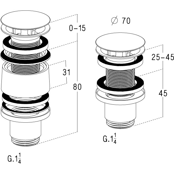 Clapet fixe recouvrant, avec bague de compensation. La gamme de bonde laiton design à écoulement libre vous offre la possibilité d'équiper l'intégralité des vasques sans trop plein du marché avec une solution design à grille ou à capot fixe.