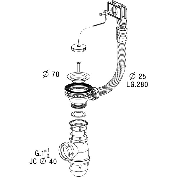 Vidage complet pour évier inox 1 bac à bouchon-chaîne ø 70 mm, avec siphon réglable en hauteur ø40 mm