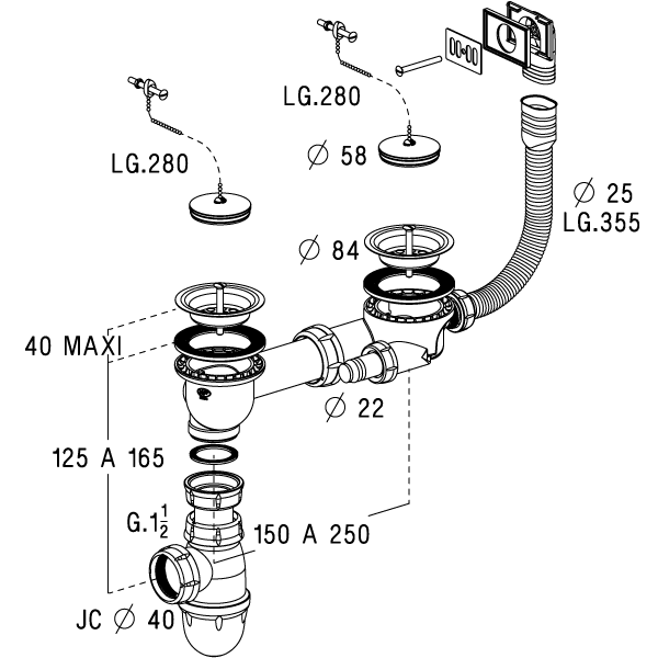 Accueil > Sanitaire > Cuisine > Vidage d'évier > Bonde de vidage plastique à bouchon-chaînette ø 84 mm pour éviers grès & synthèse 2 bacs perçage ø 60 mm, avec trop plein, tubulure grand débit avec système anti-refoulement, prise machine et trop plein interchangeables