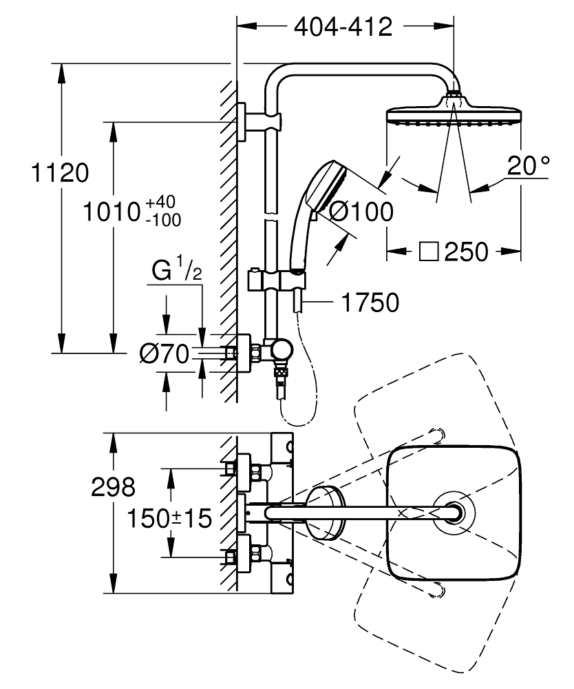 Composée de : Bras de douche de 390 mm orientable horizontalement, fixation supérieure réglable en hauteur pour ajustement sur des trous existants, mitigeur thermostatique incluant fonction inverseur 2 sorties, douchette Tempesta Cosmopolitan 100 2 jets : Pluie, Jet Curseur ajustable en hauteur Flexible Rotaflex 1750 mm 1/2" x 1/2" (28 410). GROHE TurboStat Régulation de la température quasi-instantanée et sécurité anti-brulûres en cas de coupure d'eau froide.