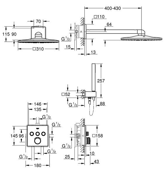 Composé de : Thermostatique encastré avec 3 sorties, Set Grohtherm, SmartControl pour installation finale, GROHE Rapido corps encastré SmartBox, Set douche de tête Rainshower SmartActive 310 Cube incluant: une douche de tête 2 jets, bras de douche horizontal 400 mm, un corps encastré pour douche de tête, Douchette Euphoria Cube, support de douche mural Euphoria Cube, Rotaflex flexible 1500 mm.