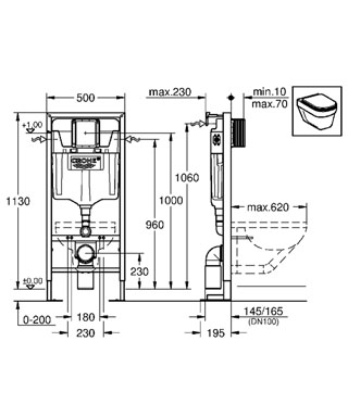 Hauteur 1,13 m (sans plaque de commande). Pour mur porteur ou non-porteur. Châssis en acier finition époxy. Mécanisme à déclenchement pneumatique. Réservoir à capot amovible 6-9 litres.